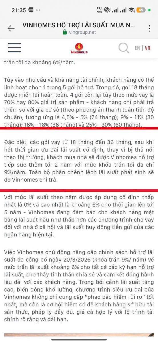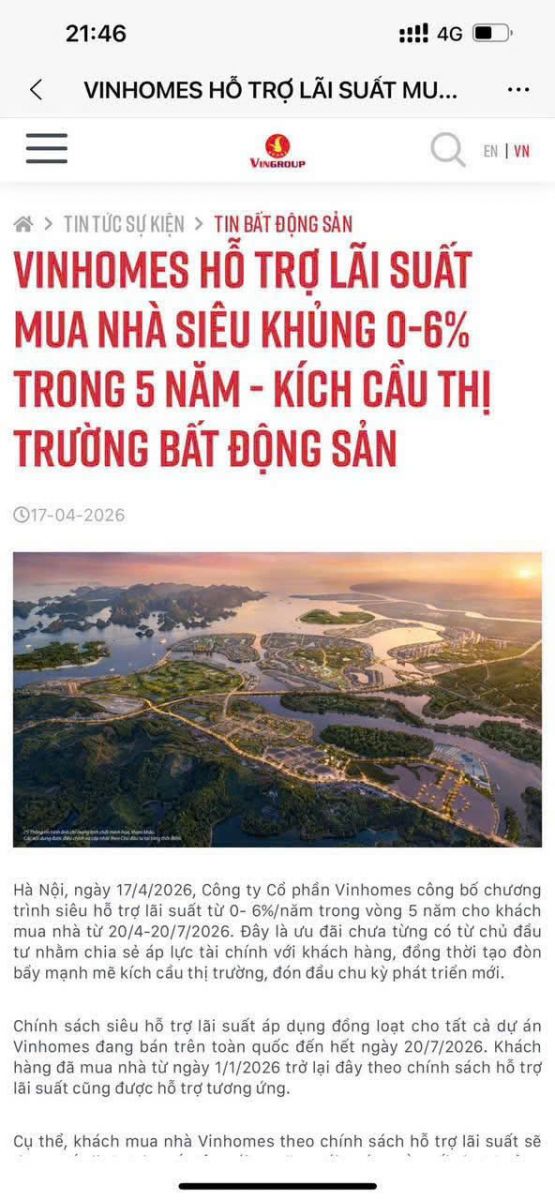CÔNG TY CỔ PHẦN VINHOMES CÔNG BỐ CHƯƠNG TRÌNH SIÊU HỖ TRỢ LÃI SUẤT TỪ 0-6% / NĂM TRONG VÒNG 5 NĂM CHO KHÁCH MUA NHÀ TỪ 20/4 - 20/7/2026